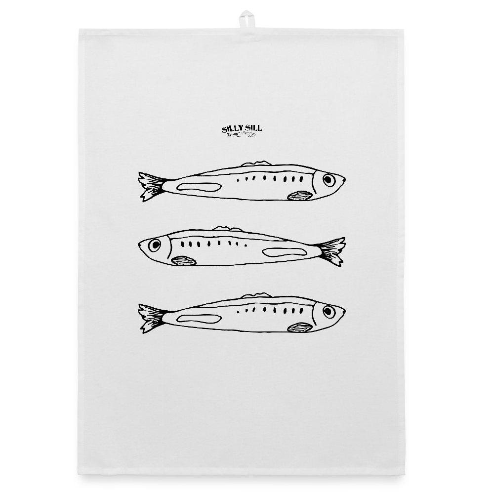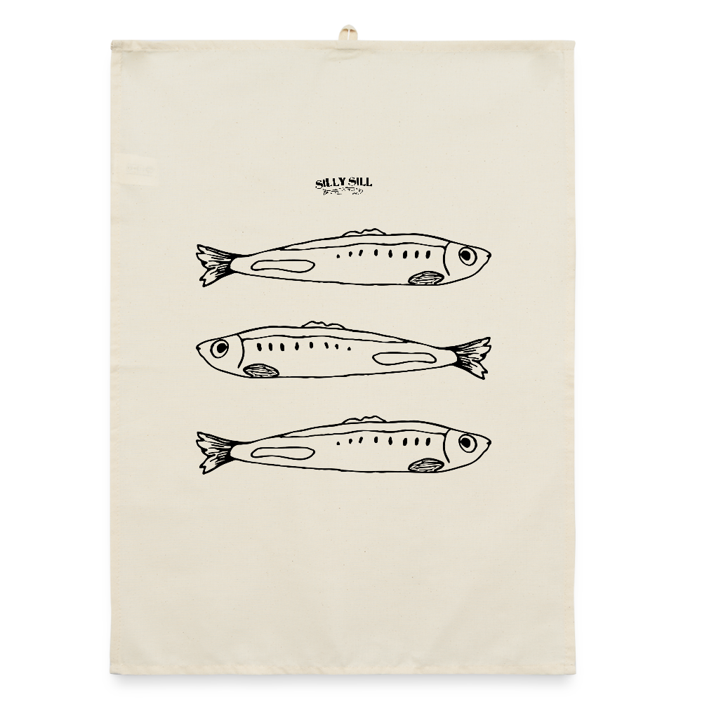 En stilren men unik detalj för ditt kök, med dem tre ikoniska silly sillarna bildar det ett fiskstims i ditt hem som väcker ett intresse men som kommer till användning med sitt genomtänka materialval för både planet med och hem gjort av 100% återvunnen ekologisk bomull som tar åt sig det den möter!